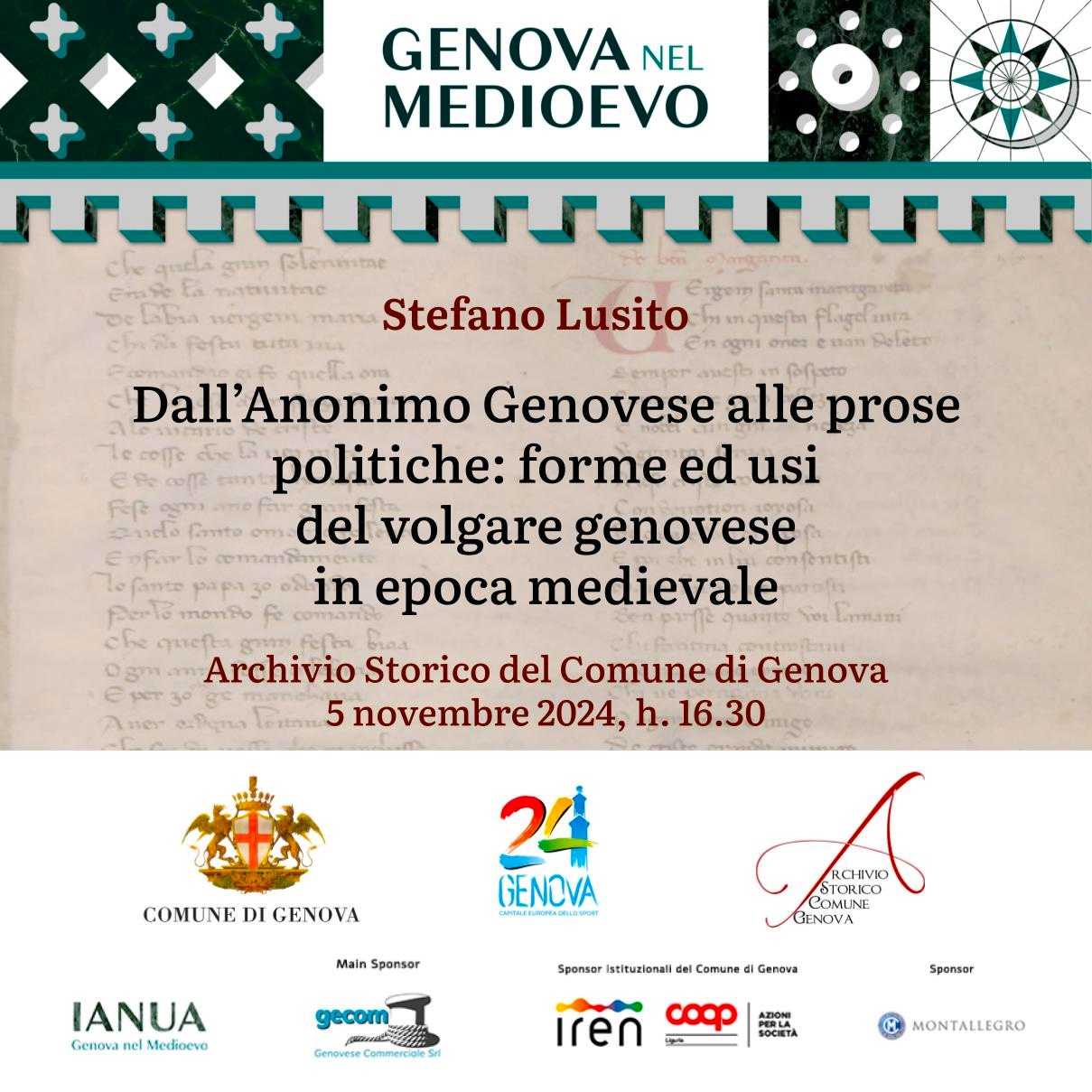 A-i pròscimi 5 de novembre à 16.30 ghe saià à l’Archivio Stòrico do Commun de Zena a conferensa «Dall’Anònimo genovese alle prose politiche: forme ed usi del volgare genovese in epoca medievale» do Steva Lusito.