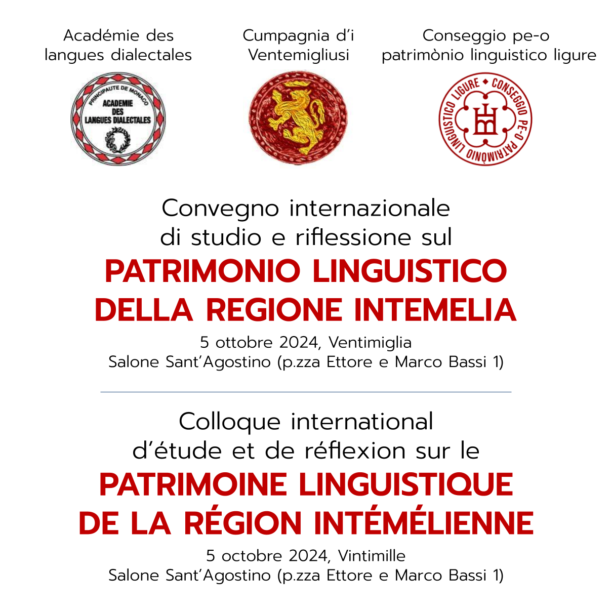 A-i pròscimi 5 d’ottobre ghe saià à Ventemiggia un «Convëgno internaçionale de studio e reflescion in sciô patrimònio linguistico da region intemelia». L’iniçiativa a l’é organizzâ da l’Académie des langues dialectales de Monego, da-a Cumpagnia d’i Ventemigliusi de Ventemiggia e da-o Conseggio pe-o patrimonio linguistico ligure.
