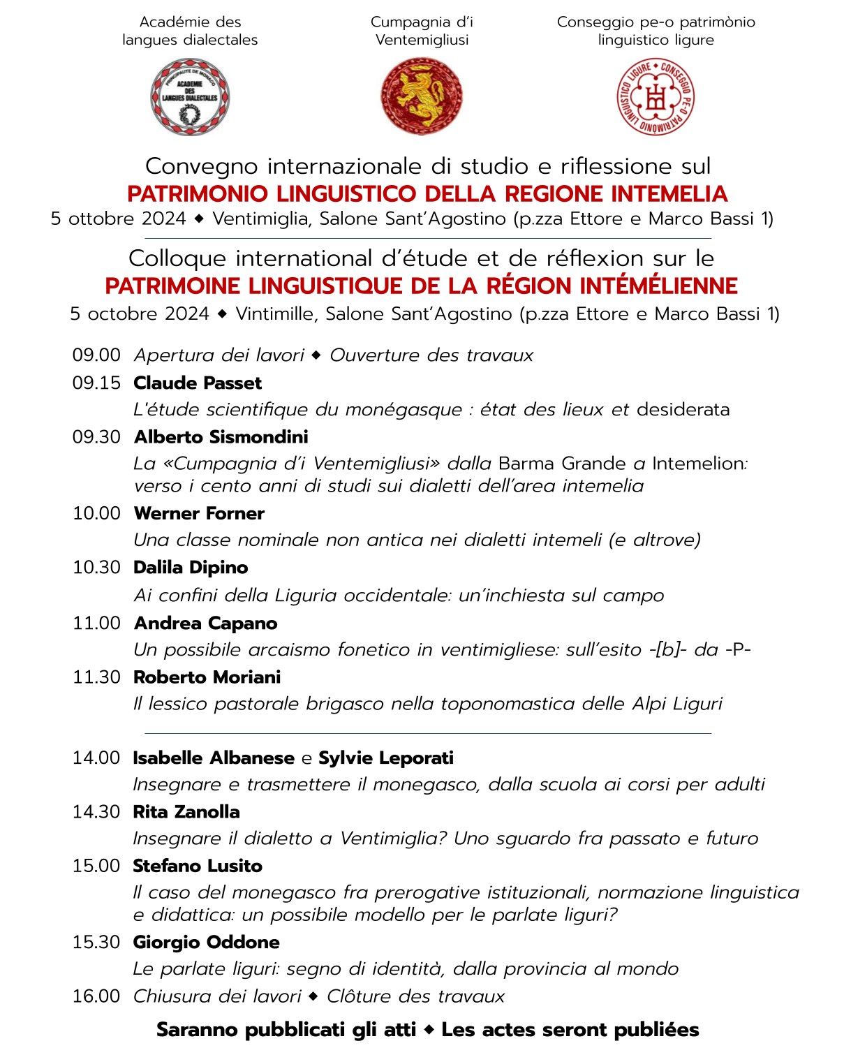 Claude Passet (L’étude scientifique du monégasque : état des lieux et desiderata); Alberto Sismondini (La «Cumpagnia d’i Ventemigliusi» dalla Barma Grande a Intemelion: verso i cento anni di studi sui dialetti dell’area intemelia); Werner Forner (Una classe nominale non antica nei dialetti intemeli (e altrove)); Dalila Dipino (Ai confini della Liguria occidentale: un’inchiesta sul campo); Andrea Capano (Un possibile arcaismo fonetico in ventimigliese: sull’esito -[b]- da -P-); Roberto Moriani (Il lessico pastorale brigasco nella toponomastica delle Alpi Liguri); Isabelle Albanese e Sylvie Leporati (Insegnare e trasmettere il monegasco, dalla scuola ai corsi per adulti); Rita Zanolla (Insegnare il dialetto a Ventimiglia? Uno sguardo fra passato e futuro); Stefano Lusito (Il caso del monegasco fra prerogative istituzionali, normazione linguistica e didattica: un possibile modello per le parlate liguri?); Giorgio Oddone (Le parlate liguri: segno di identità, dalla provincia al mondo).